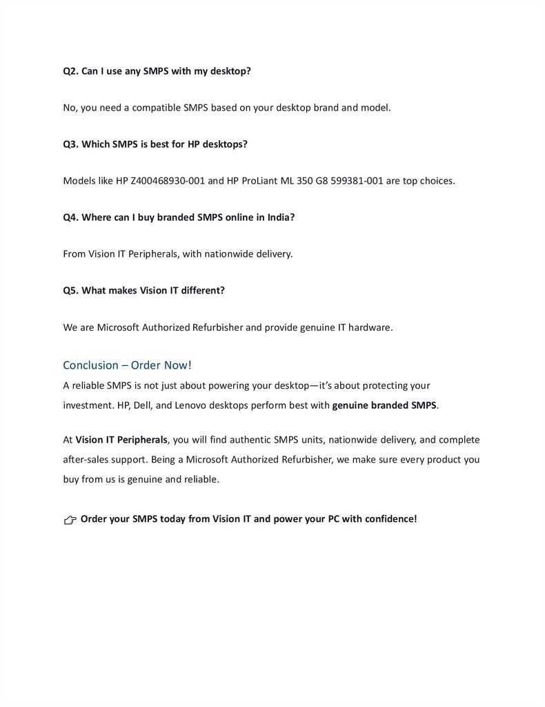 Q2. Can I use any SMPS with my desktop?No, you need a compatible SMPS based on your desktop brand and model.