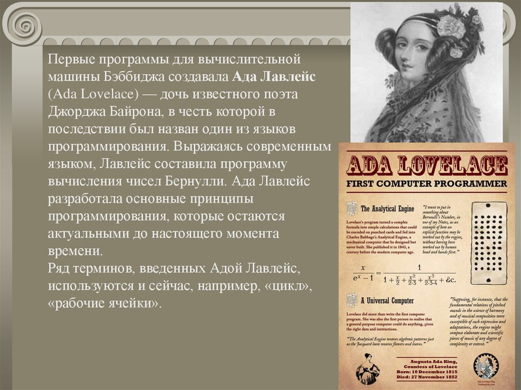Первые программы для вычислительноймашины Бэббиджа создавала Ада Лавлейс