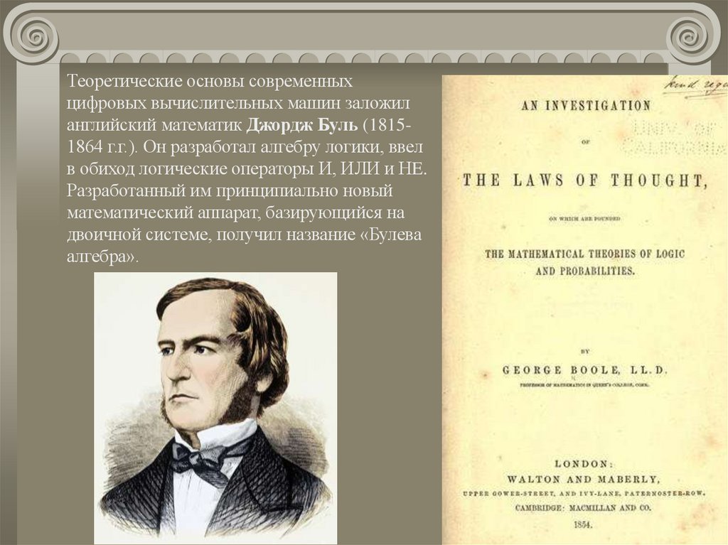 английский математик Джордж Буль (18151864 г.г.). Он разработал алгебру логики, ввел