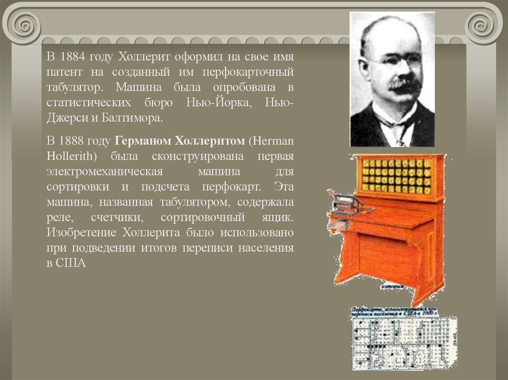 В 1884 году Холлерит оформил на свое имяпатент на созданный им перфокарточный