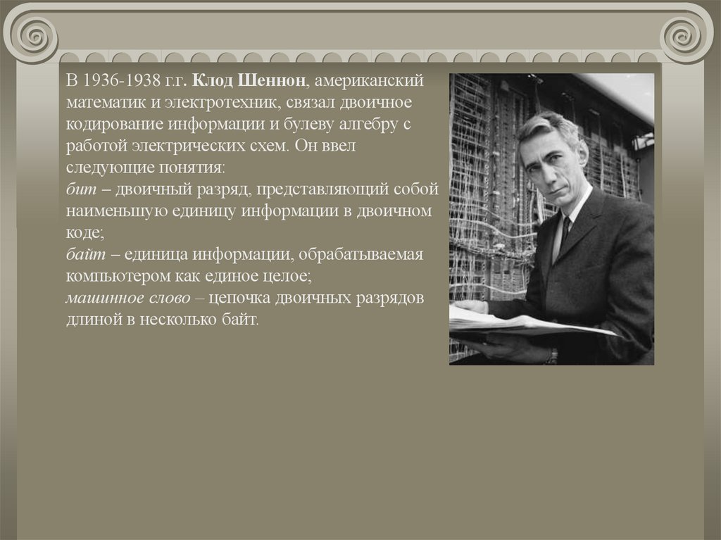 В 1936-1938 г.г. Клод Шеннон, американскийматематик и электротехник, связал двоичное