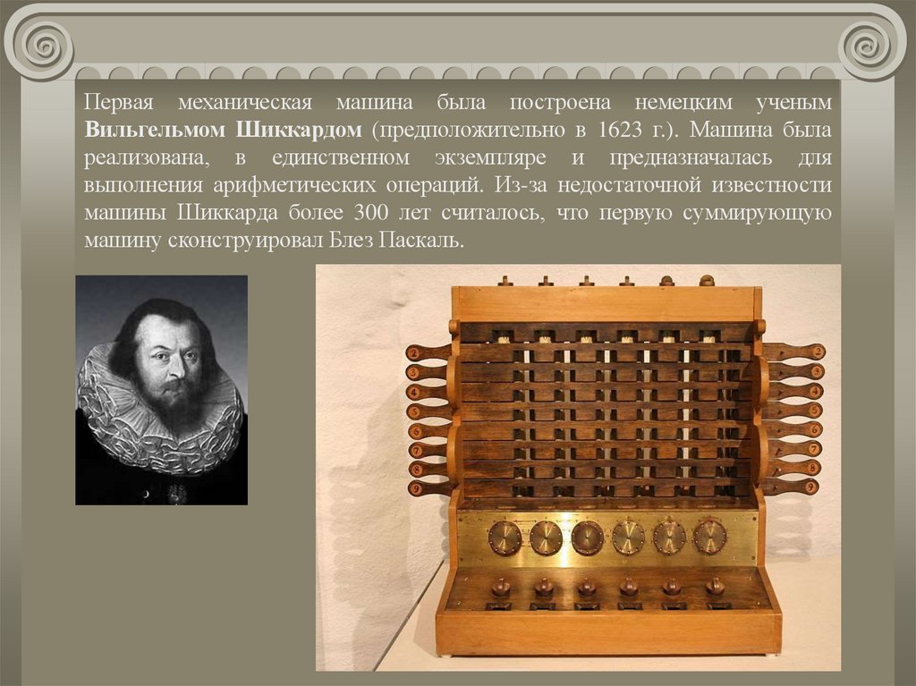 Первая механическая машина была построена немецким ученымВильгельмом Шиккардом (предположительно в 1623 г.). Машина была