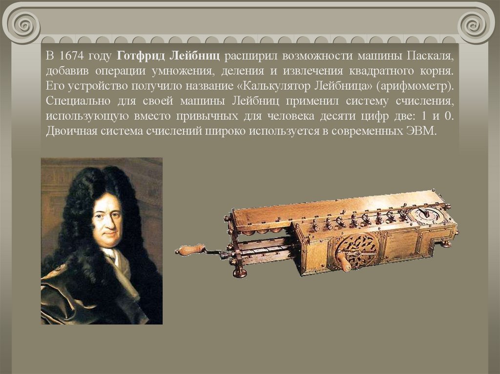 В 1674 году Готфрид Лейбниц расширил возможности машины Паскаля,добавив операции умножения, деления и извлечения квадратного корня.