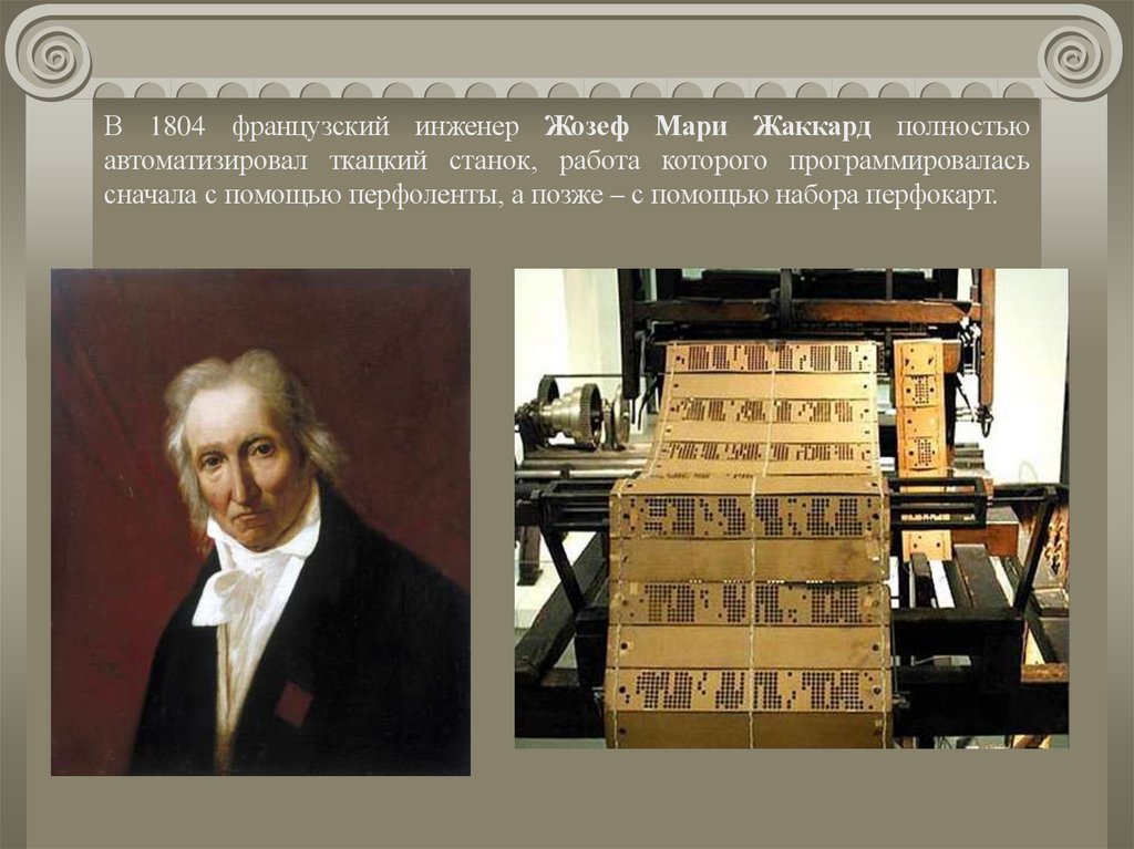 В 1804 французский инженер Жозеф Мари Жаккард полностьюавтоматизировал ткацкий станок, работа которого программировалась