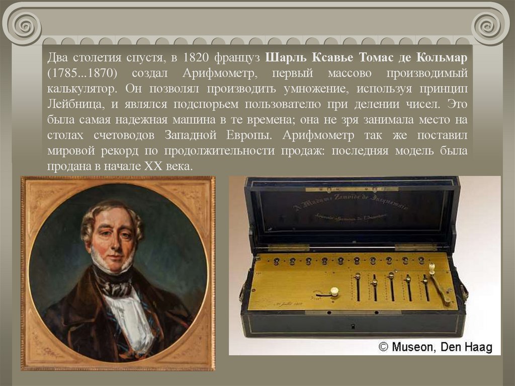 Два столетия спустя, в 1820 француз Шарль Ксавье Томас де Кольмар(1785...1870) создал Арифмометр, первый массово производимый