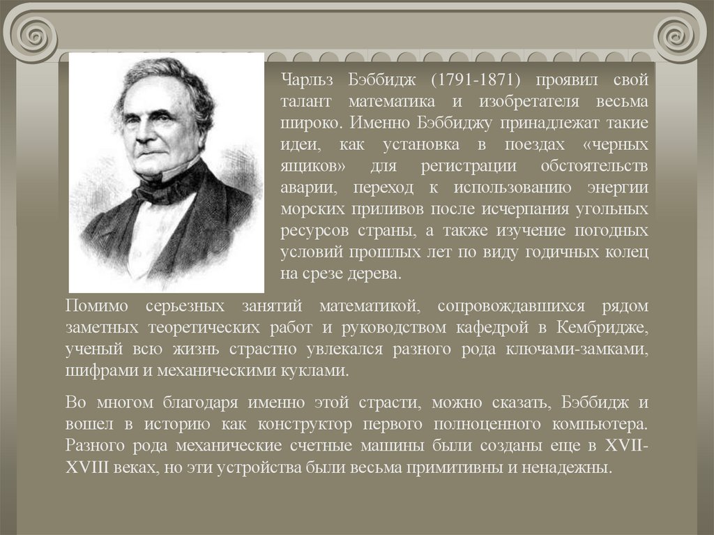 Чарльз Бэббидж (1791-1871) проявил свойталант математика и изобретателя весьма