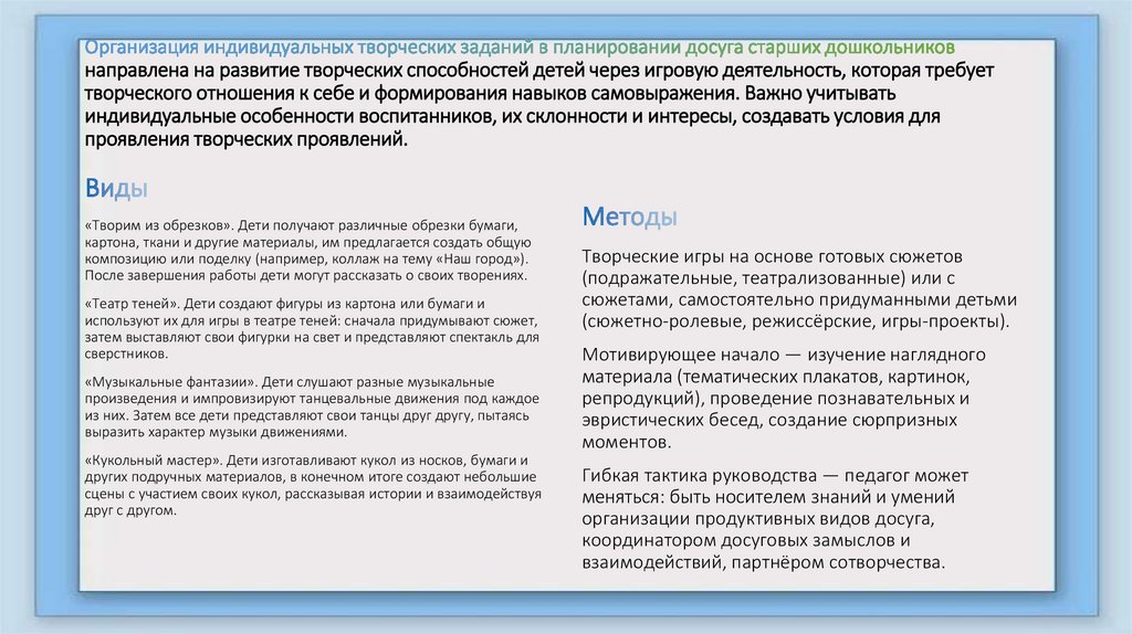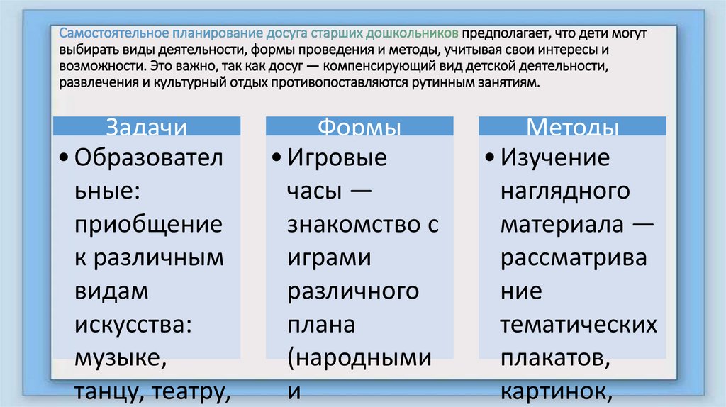 - овладение приёмами эффективной организации досуговой