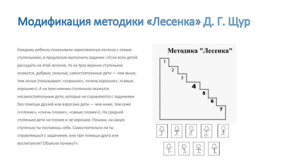 Каждому ребенку показывали нарисованную лесенку с семьюступеньками, и предлагали выполнить задание: «Если всех детей