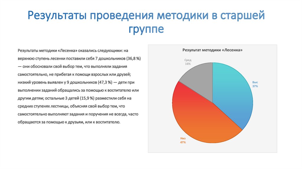 Результаты методики «Лесенка» оказались следующими: наверхнюю ступень лесенки поставили себя 7 дошкольников (36,8 %)