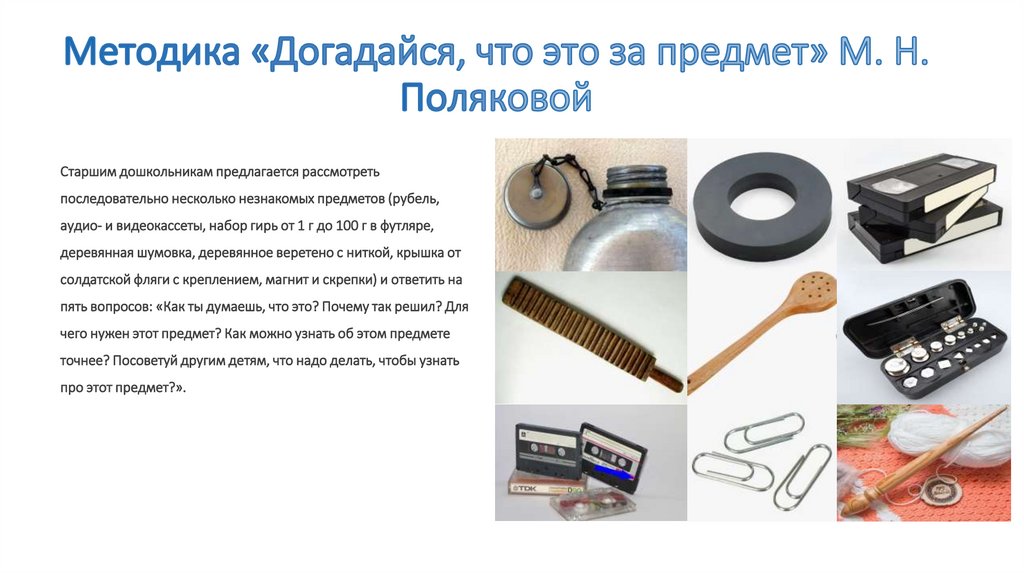 Старшим дошкольникам предлагается рассмотретьпоследовательно несколько незнакомых предметов (рубель,