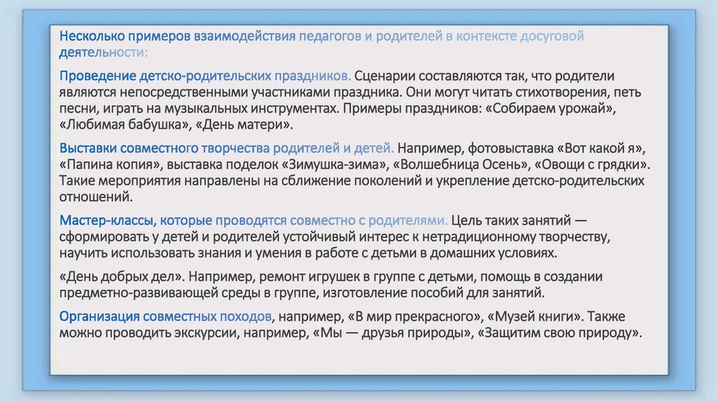 Сценарии составляются так, что родителиявляются непосредственными участниками праздника. Они могут читать стихотворения, петь
