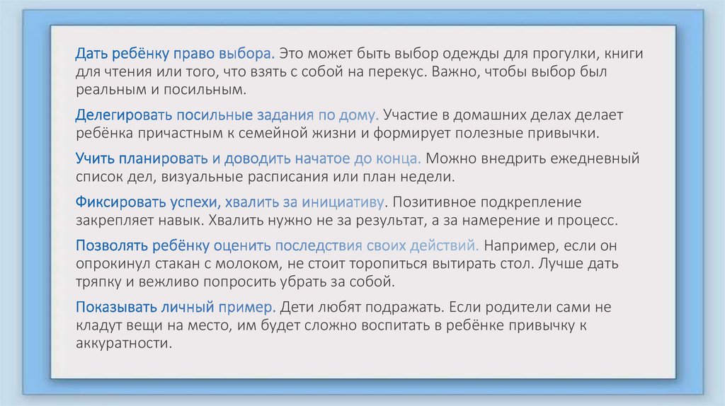 Поощрение инициативы. Важно поощрять желание ребёнка сделать что-то самому. Например, можно доверить