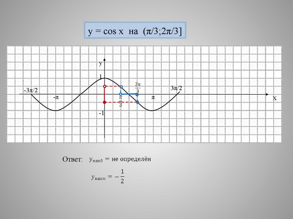 4)Найти наибольшее и наименьшее значения функции на [-π/3;2π) для №2.