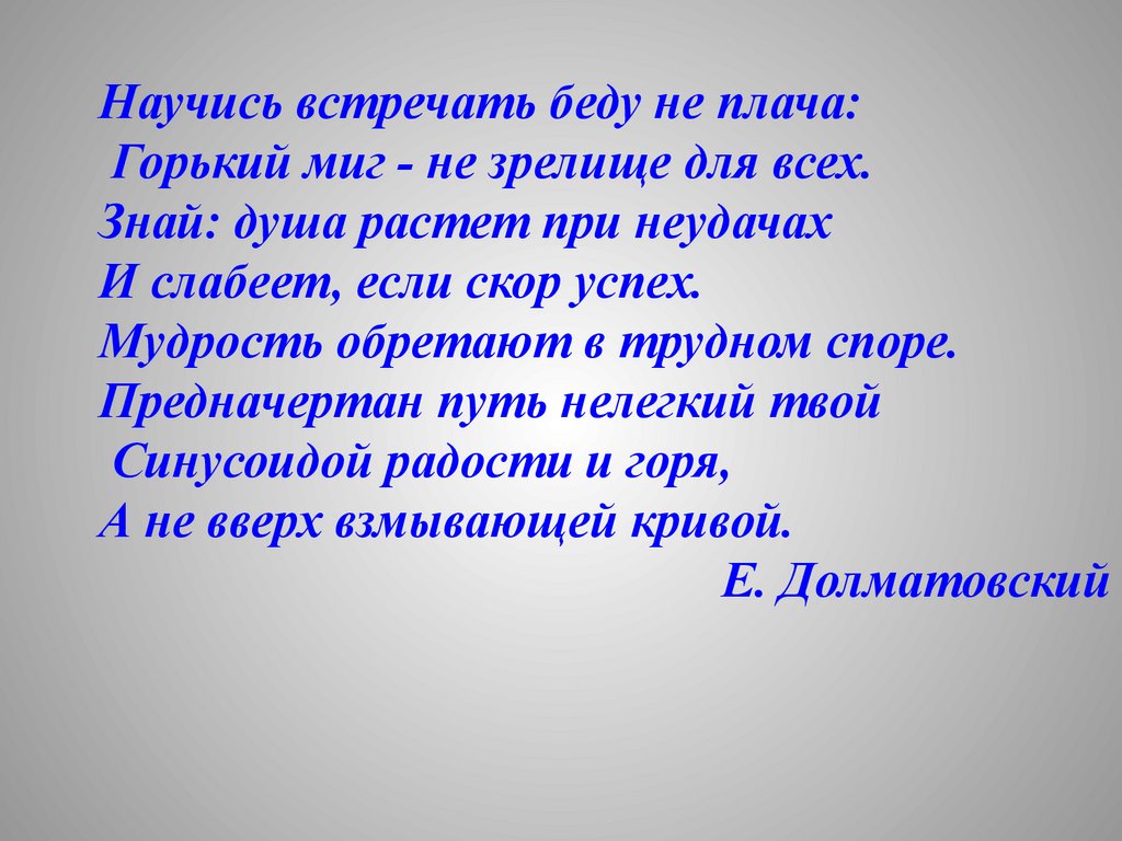 Научись встречать беду не плача:Горький миг - не зрелище для всех.