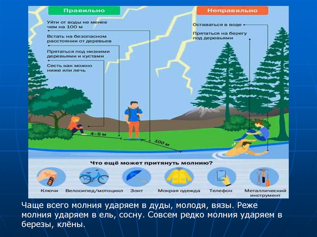 Чаще всего молния ударяем в дуды, молодя, вязы. Режемолния ударяем в ель, сосну. Совсем редко молния ударяем в