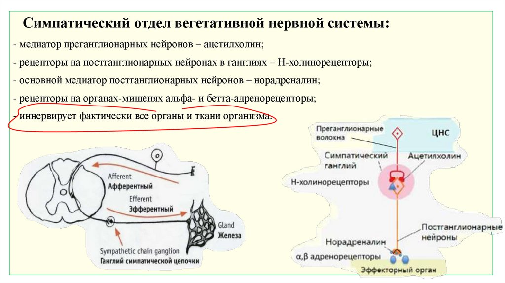 Симпатический отдел вегетативной нервной системы:- медиатор преганглионарных нейронов – ацетилхолин;