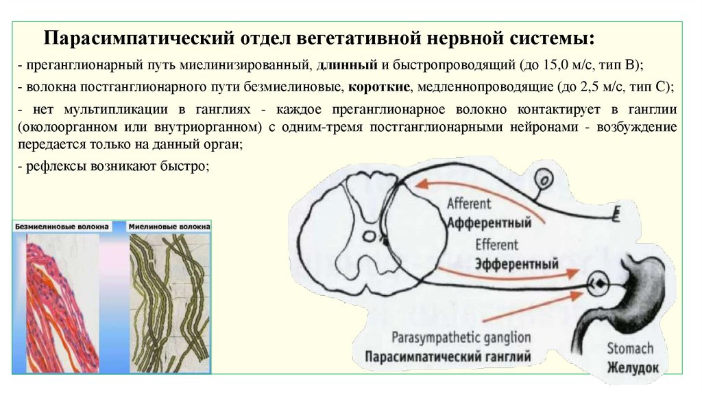Парасимпатический отдел вегетативной нервной системы:- преганглионарный путь миелинизированный, длинный и быстропроводящий (до 15,0 м/с, тип В);