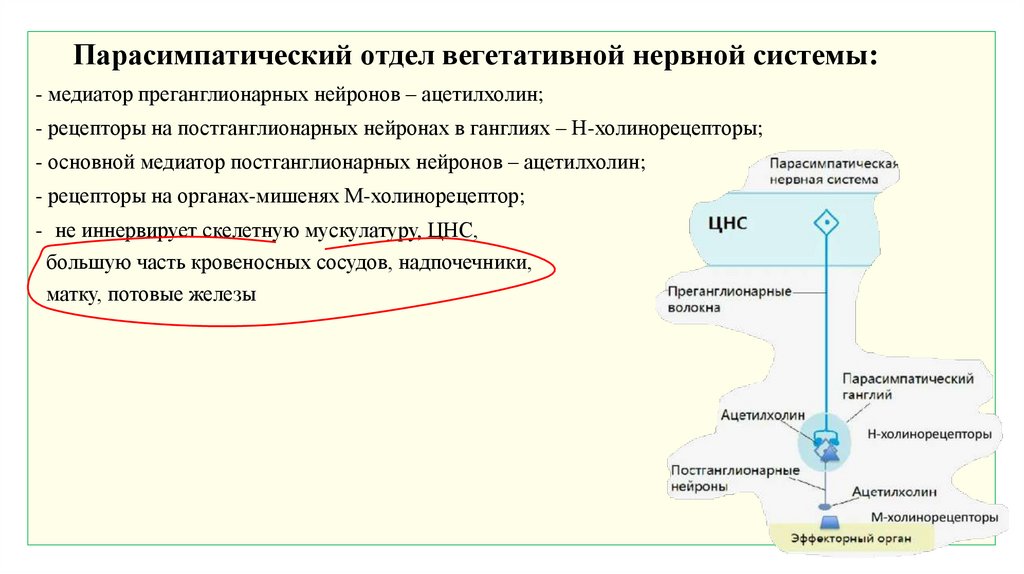 Парасимпатический отдел вегетативной нервной системы:- медиатор преганглионарных нейронов – ацетилхолин;