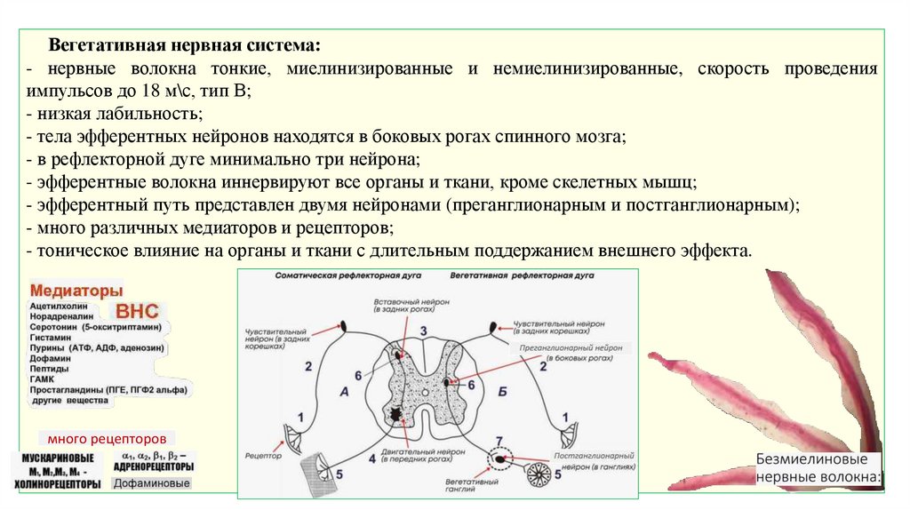 Вегетативная нервная система:- нервные волокна тонкие, миелинизированные и немиелинизированные, скорость проведения