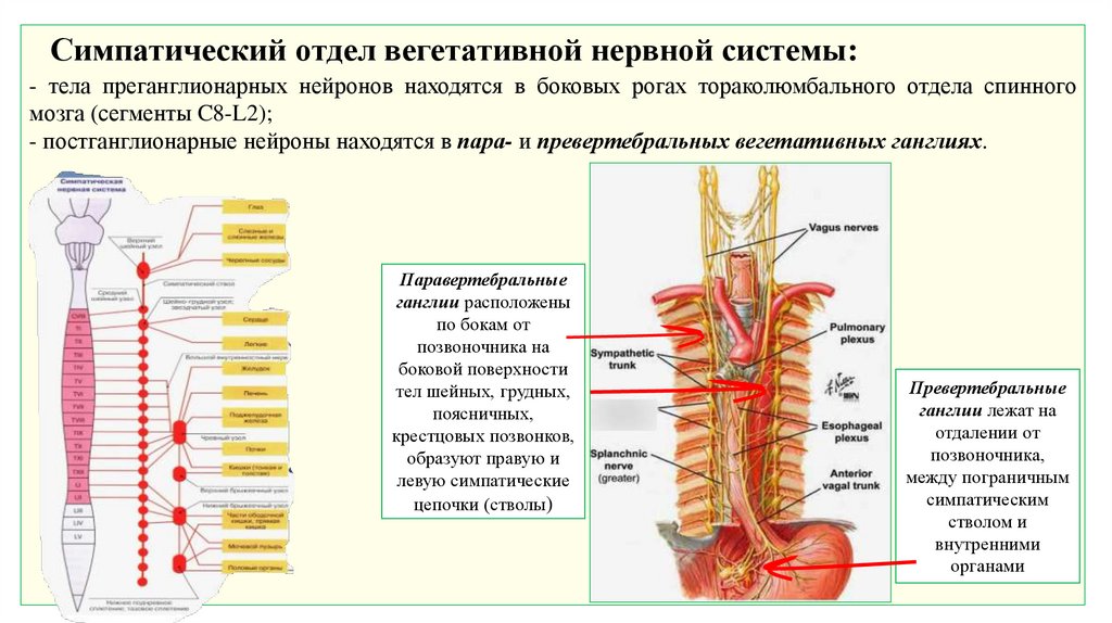 - постганглионарные нейроны находятся в пара- и превертебральных вегетативных ганглиях.