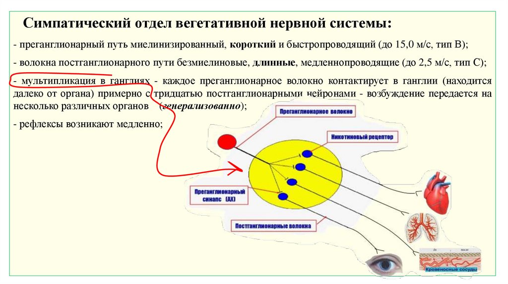Симпатический отдел вегетативной нервной системы:- преганглионарный путь миелинизированный, короткий и быстропроводящий (до 15,0 м/с, тип В);