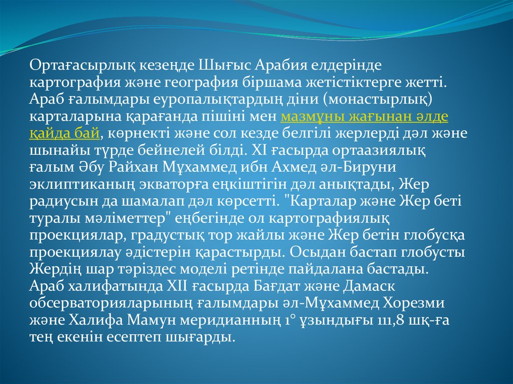 Ортағасырлық кезеңде Шығыс Арабия елдеріндекартография және география біршама жетістіктерге жетті.