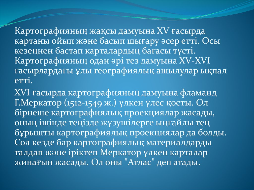 Г.Меркатор (1512-1549 ж.) үлкен үлес қосты. Ол
