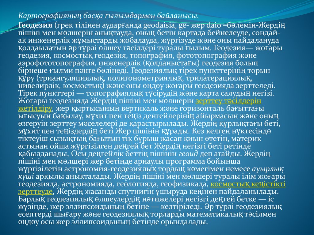Картографияның басқа ғылымдармен байланысы.Геодезия (грек тілінен аударғанда geodaisia, ge- жер daio –бөлемін-Жердің