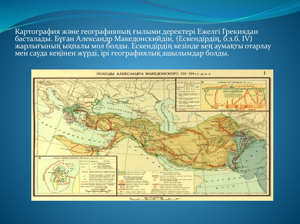 Картография және географияның ғылыми деректері Ежелгі Грекияданбасталады. Бұған Александр Македонскийдін, (Ескендірдің, б.з.б. IV)