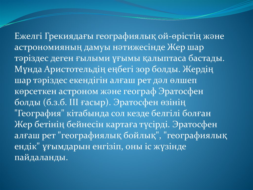 Ежелгі Грекиядағы географиялық ой-өрістің жәнеастрономияның дамуы нәтижесінде Жер шар