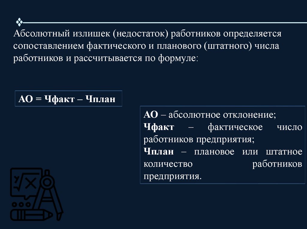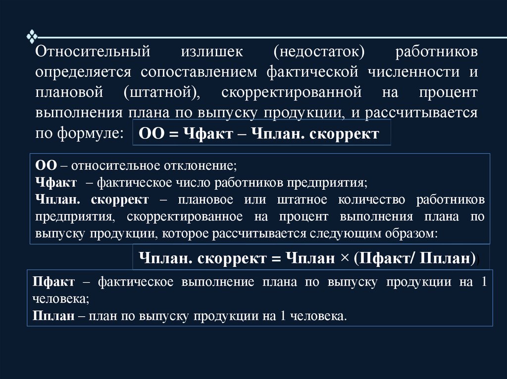 Абсолютный излишек (недостаток) работников определяетсясопоставлением фактического и планового (штатного) числа