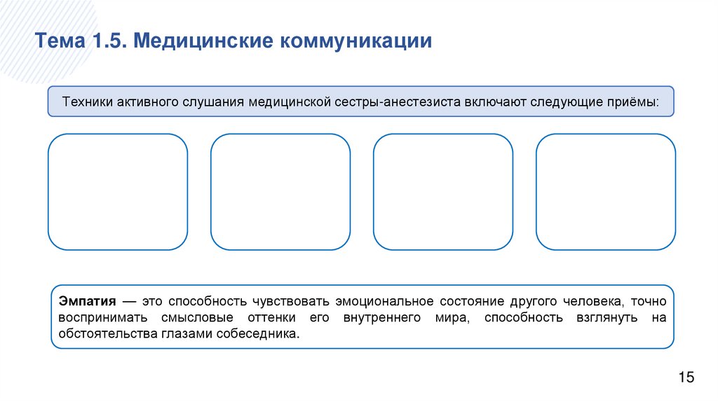 Тема 1.5. Медицинские коммуникацииТехники активного слушания медицинской сестры-анестезиста включают следующие приёмы: