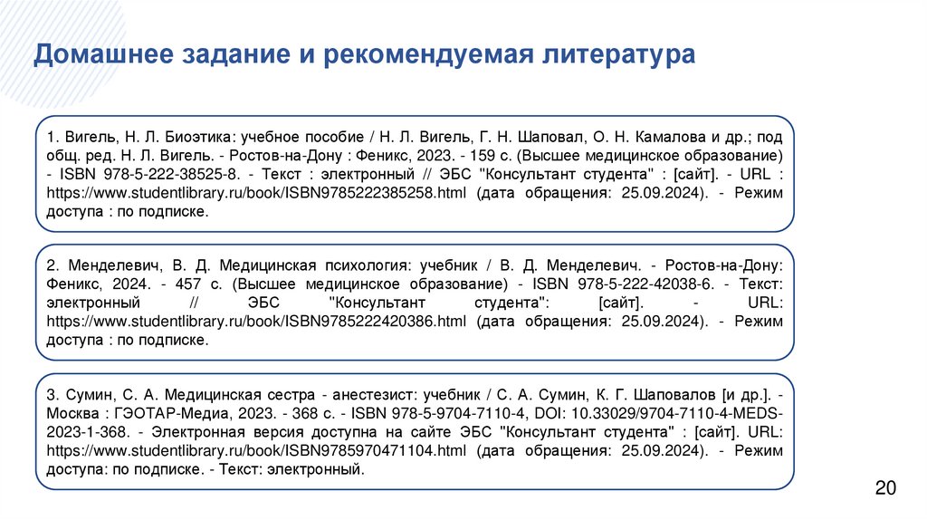 Домашнее задание и рекомендуемая литература1. Вигель, Н. Л. Биоэтика: учебное пособие / Н. Л. Вигель, Г. Н. Шаповал, О. Н. Камалова и др.; под
