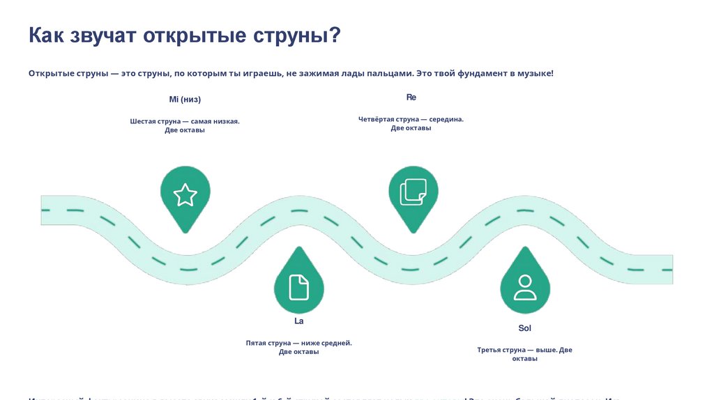 Как звучат открытые струны?Открытые струны — это струны, по которым ты играешь, не зажимая лады пальцами. Это твой фундамент в музыке!