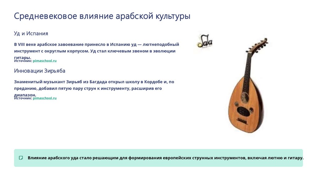Влияние арабского уда стало решающим для формирования европейских струнных инструментов, включая лютню и гитару.
