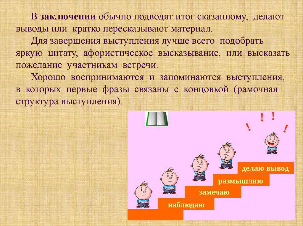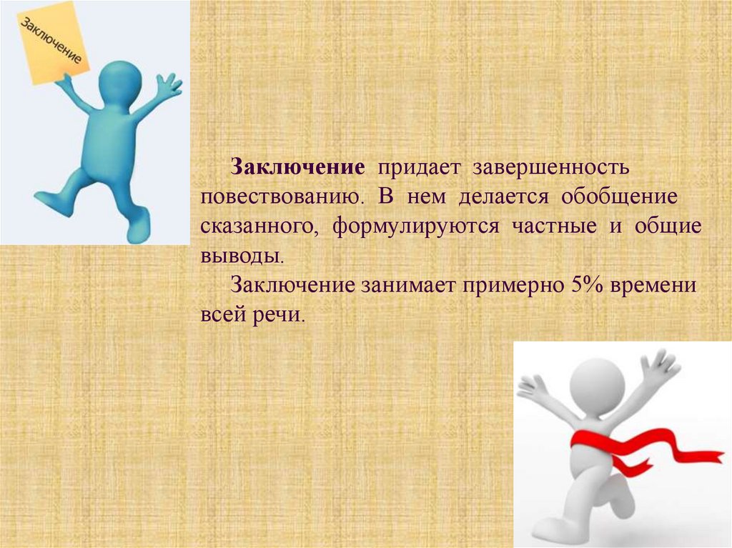 В заключении обычно подводят итог сказанному, делаютвыводы или кратко пересказывают материал.