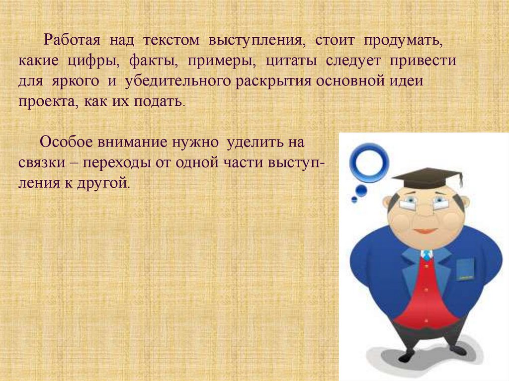 Работая над текстом выступления, стоит продумать,какие цифры, факты, примеры, цитаты следует привести