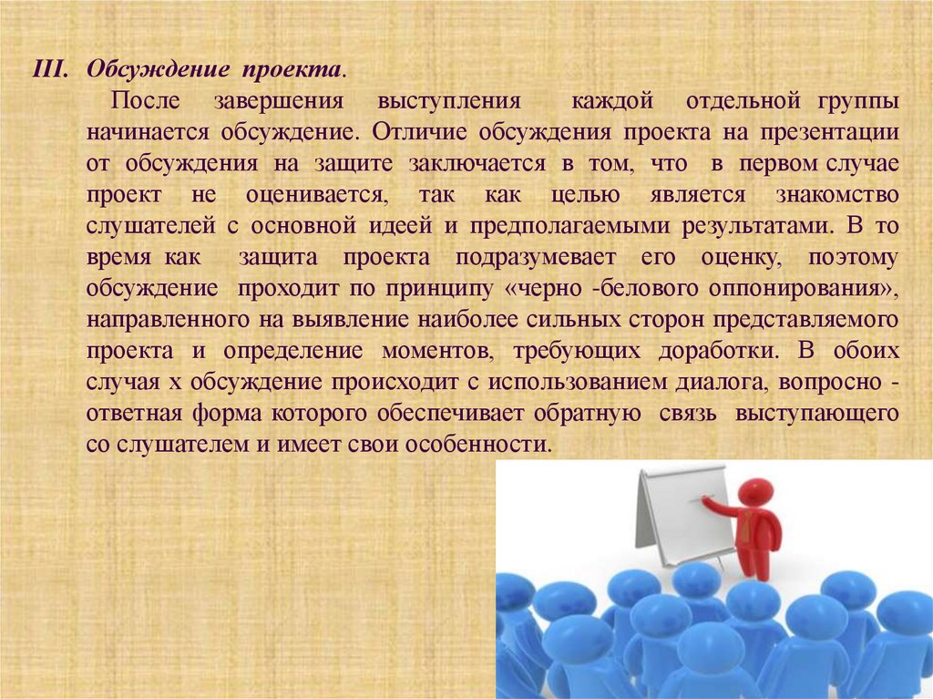 начинается обсуждение. Отличие обсуждения проекта на презентации