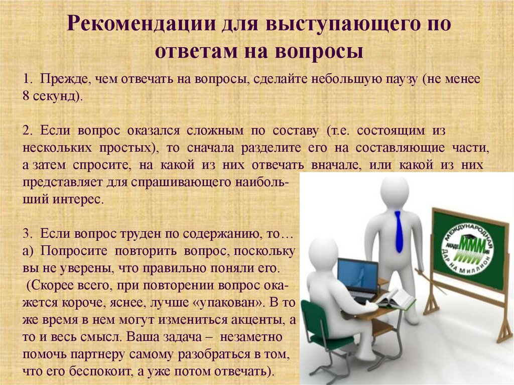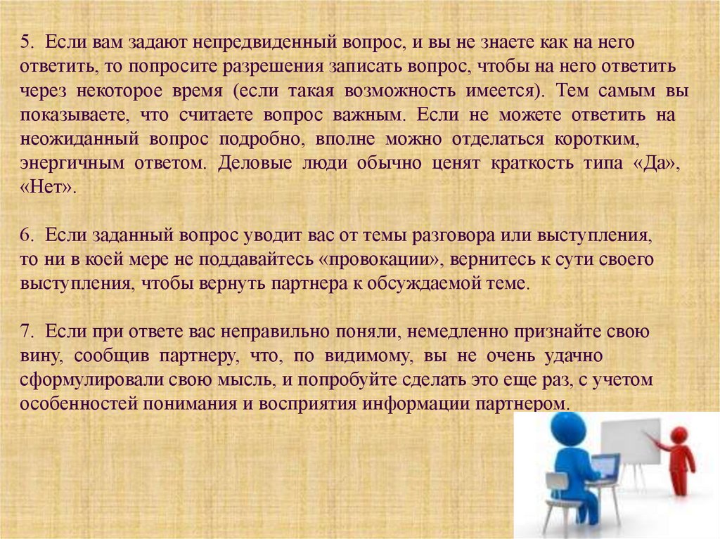 5. Если вам задают непредвиденный вопрос, и вы не знаете как на негоответить, то попросите разрешения записать вопрос, чтобы на него ответить