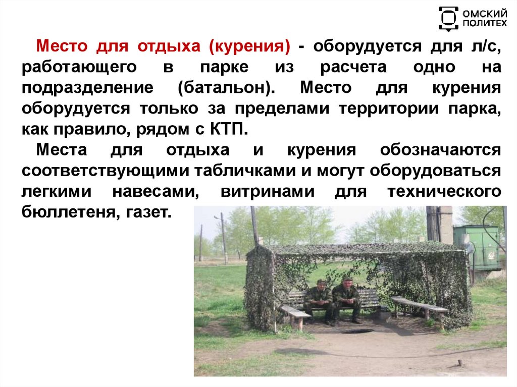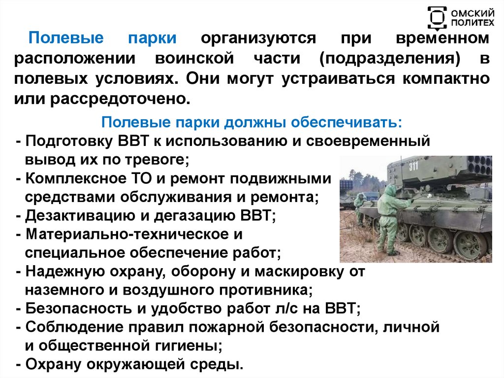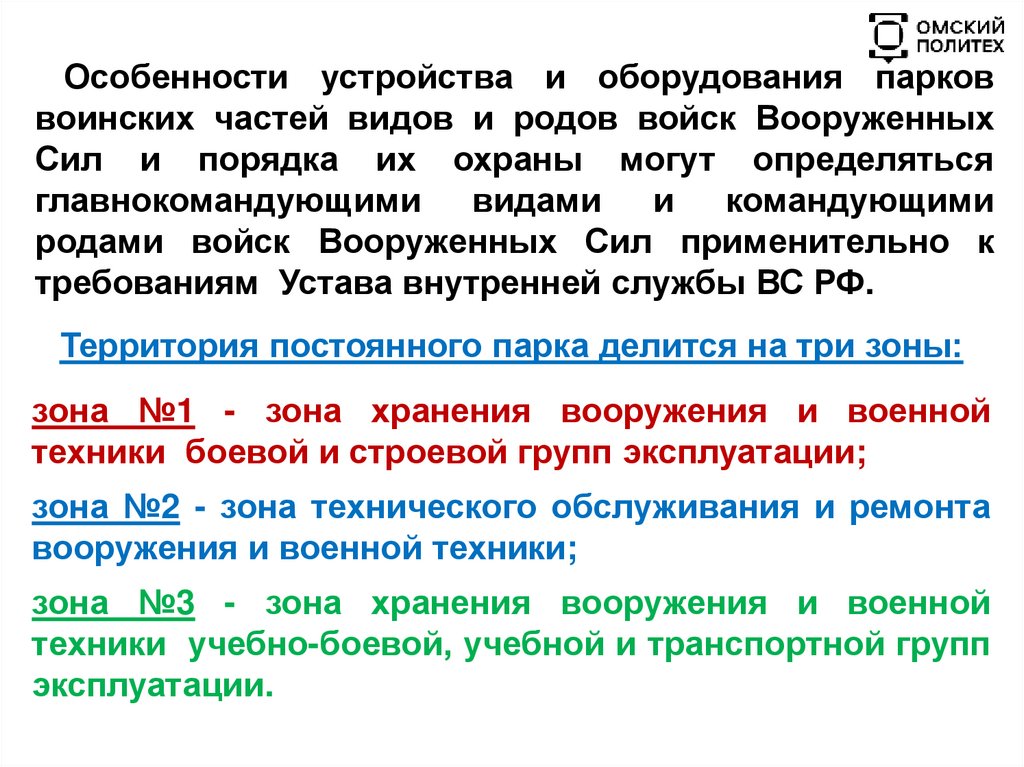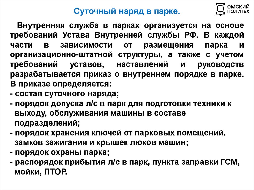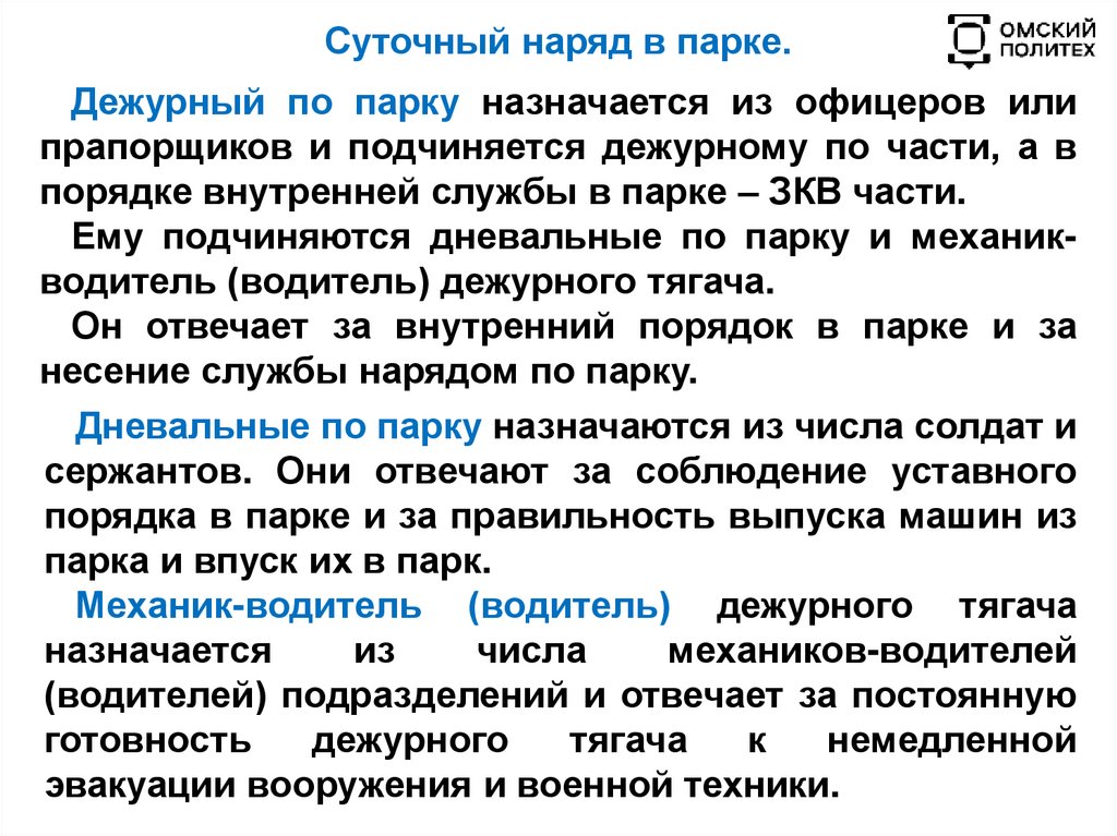 Суточный наряд в парке.Внутренняя служба в парках организуется на основе