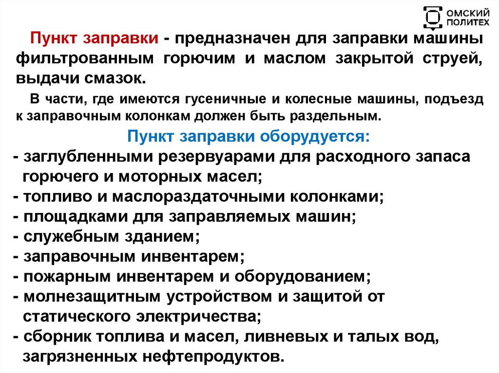 - распорядок прибытия л/с в парк, пункта заправки ГСМ,