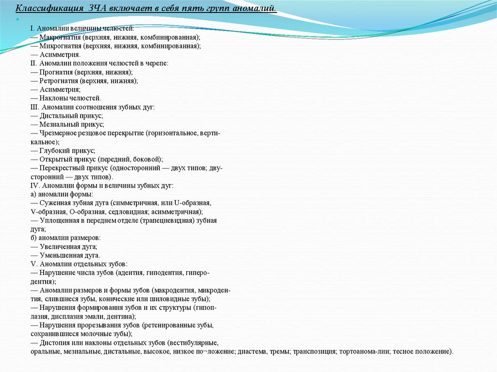 Классификация ЗЧА включает в себя пять групп аномалий.I. Аномалии величины челюстей: