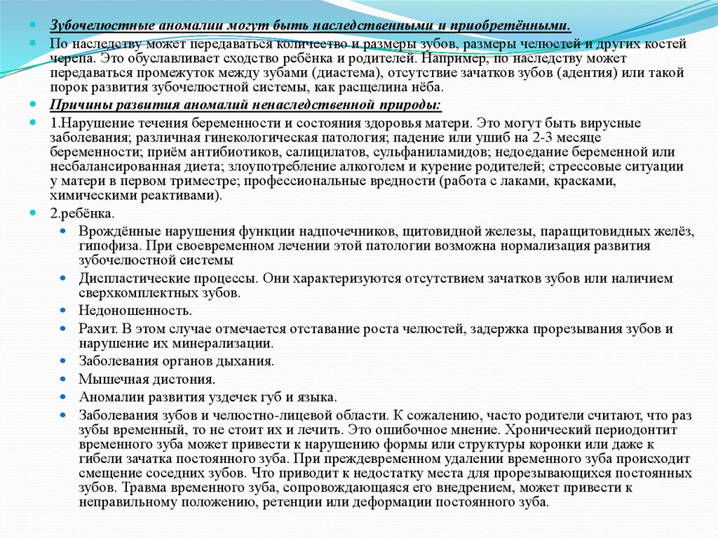 Зубочелюстные аномалии могут быть наследственными и приобретёнными.По наследству может передаваться количество и размеры зубов, размеры челюстей и других костей