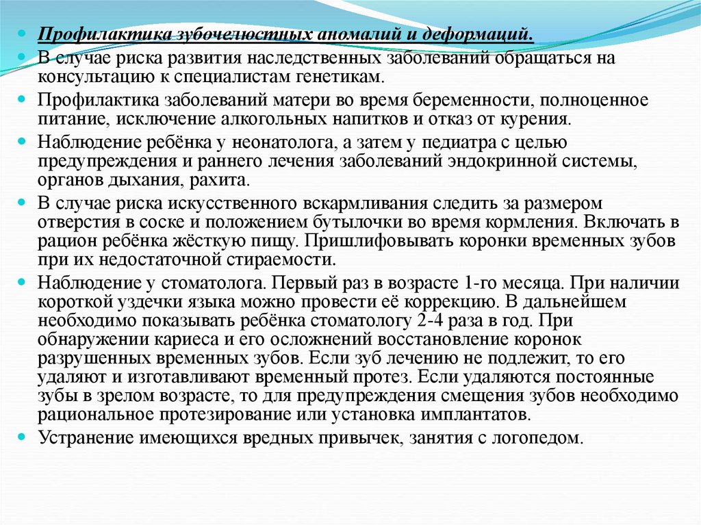 Профилактика зубочелюстных аномалий и деформаций.В случае риска развития наследственных заболеваний обращаться на