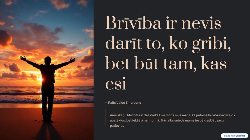 Amerikāņu filozofs un dzejnieks Emersons mūs māca, ka patiesa brīvība nav ārējos