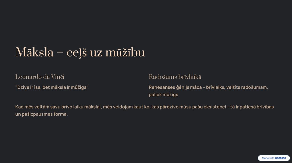 Kad mēs veltām savu brīvo laiku mākslai, mēs veidojam kaut ko, kas pārdzīvo mūsu pašu eksistenci – tā ir patiesā brīvības