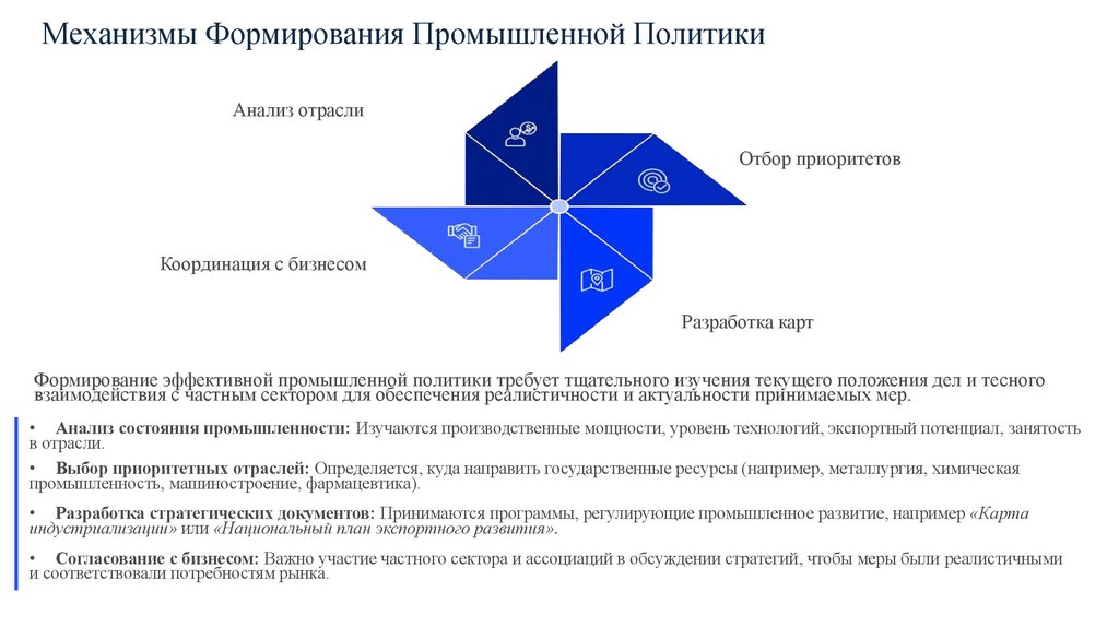 программы поддержки предприятий (промышленная политика) и привлекает инвесторов в отрасль (инвестиционная политика).