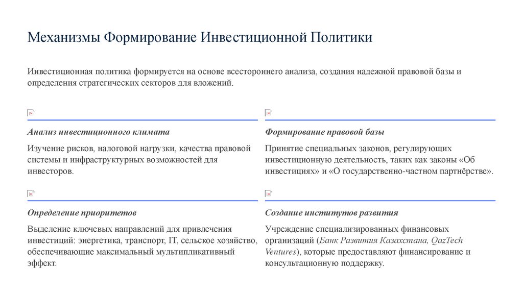 Механизмы Формирование Инвестиционной ПолитикиИнвестиционная политика формируется на основе всестороннего анализа, создания надежной правовой базы и