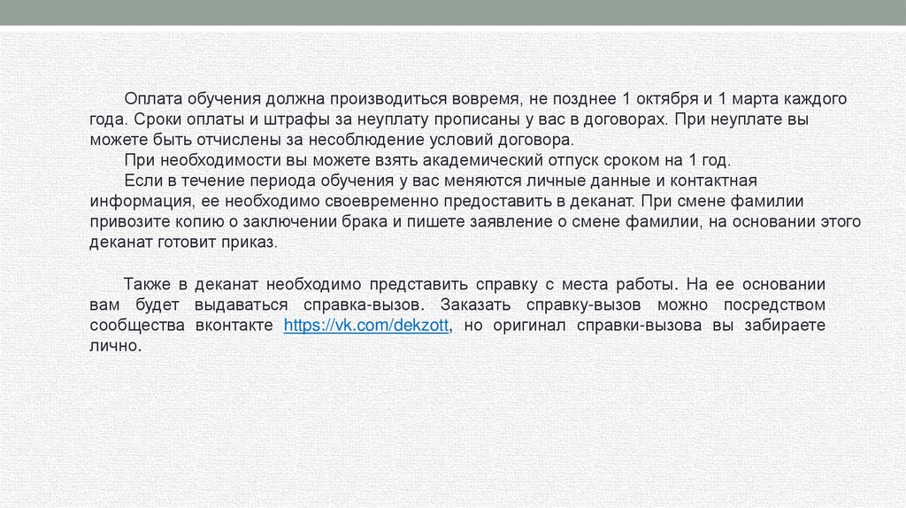 Оплата обучения должна производиться вовремя, не позднее 1 октября и 1 марта каждогогода. Сроки оплаты и штрафы за неуплату прописаны у вас в договорах. При неуплате вы