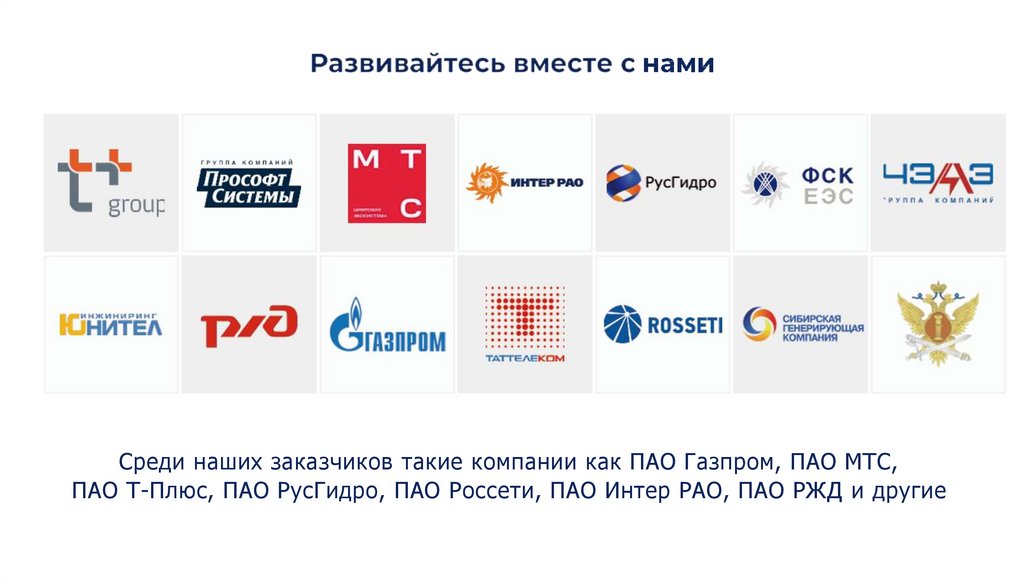 Среди наших заказчиков такие компании как ПАО Газпром, ПАО МТС,ПАО Т-Плюс, ПАО РусГидро, ПАО Россети, ПАО Интер РАО, ПАО РЖД и другие